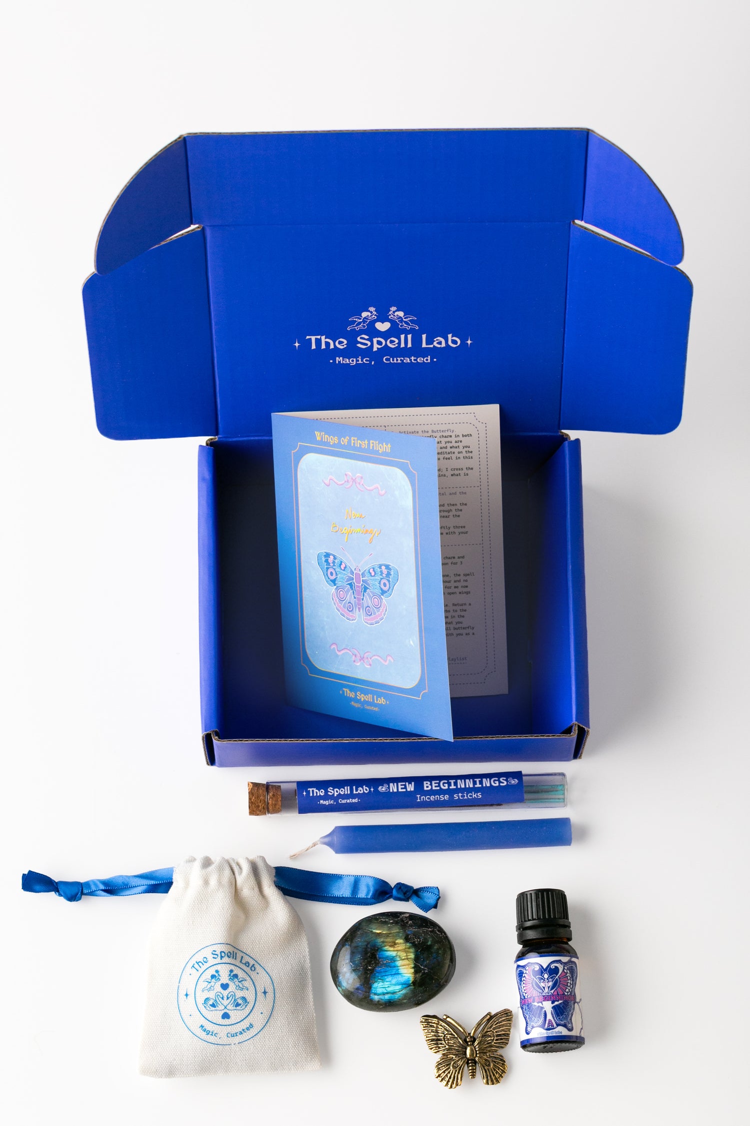 Featuring a butterfly charm, labradorite crystal, blue spell candle, anointing oil with notes of sweet orange, cedarwood, rosemary and frankincense, magical herbs, incense and detailed instrucitons - a ritual to