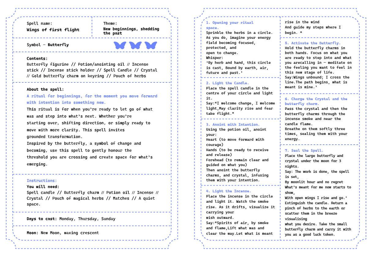 Wings of First Flight is a ritual for new beginnings, a way to honour change and move into the next chapter with intention. Whether you are starting over, shifting direction, or simply ready to embrace more clarity, this ritual creates space for grounded transformation.